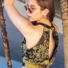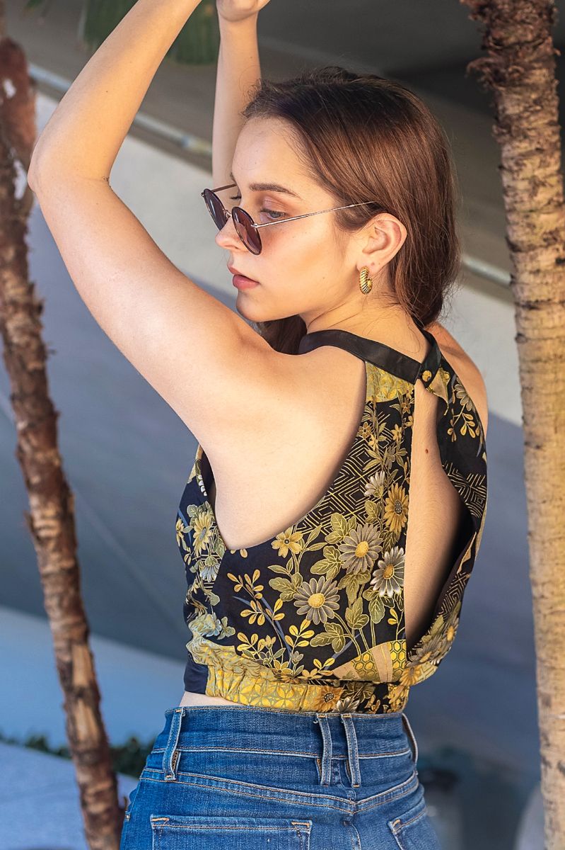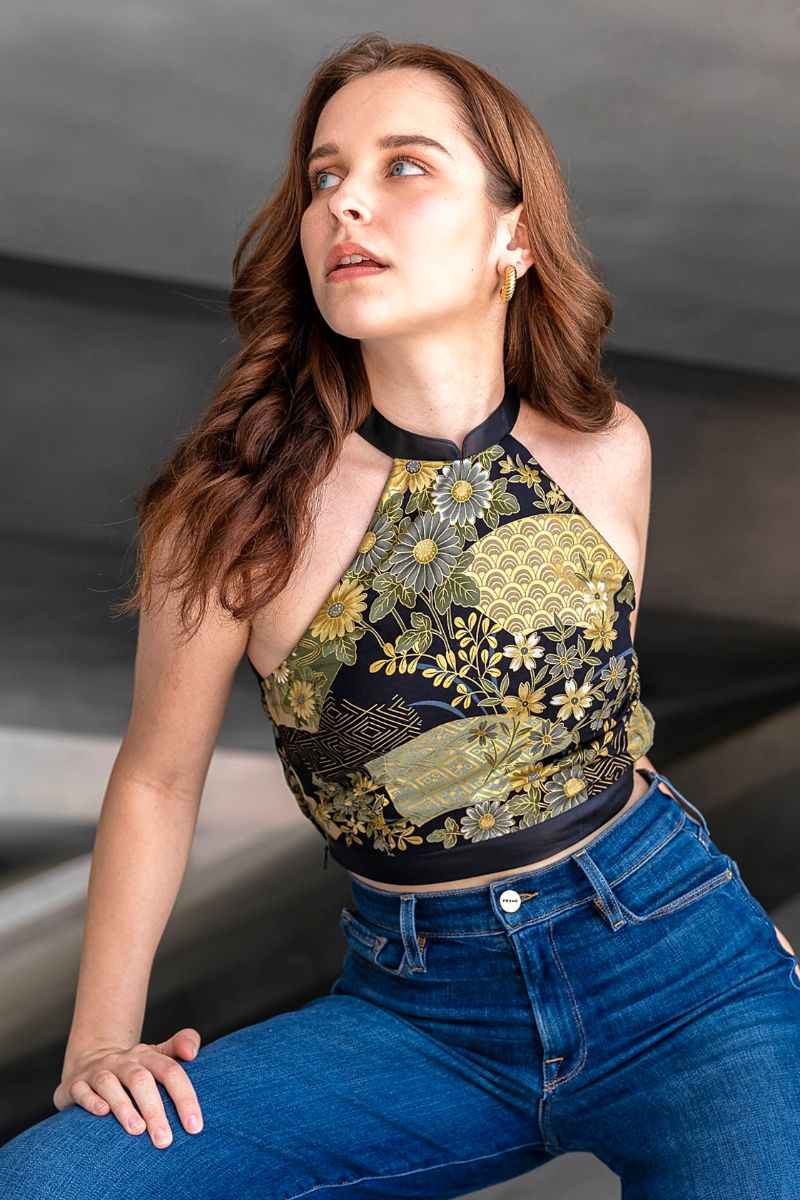 Dive into a new realm of bold beauty with our glamourous YUYAMI 夕闇 Mandarin Halter. Featuring soft black leather detailing on the mandarin collar and front waistbelt, anchored by a halter style bodice showcasing a magnificent Japanese kimono print of gold thread floral and fan motifs. The straight-cut back panel design allows for a little of your back to peek through too, adding to the bold and alluring aesthetic.